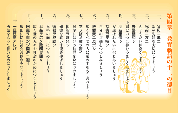 前半は、明治23年10月30日の教育勅語発布当時の、芳川顕正文部大臣、山縣有朋総理大臣、石井昇一郎岩手県知事の談話を中心とした教育勅語成立史の解説。後半は青少年にも内容が理解できるように教育勅語の詳しい現代語訳と、カラー版で天照大神、神武天皇、仁徳天皇などの事例をとり入れて解説してあります。